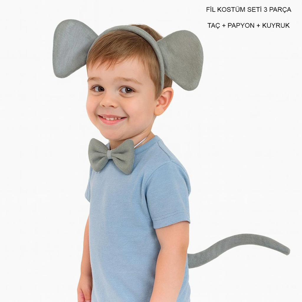 Fil Kostümü Aksesuar Seti 3 Lü - Taç Papyon Kuyruk