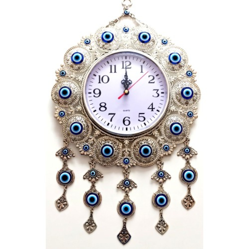 Nikel Zamak Kaplamalı Nazar Boncuklu Gümüş Rengi Mini Duvar Saati