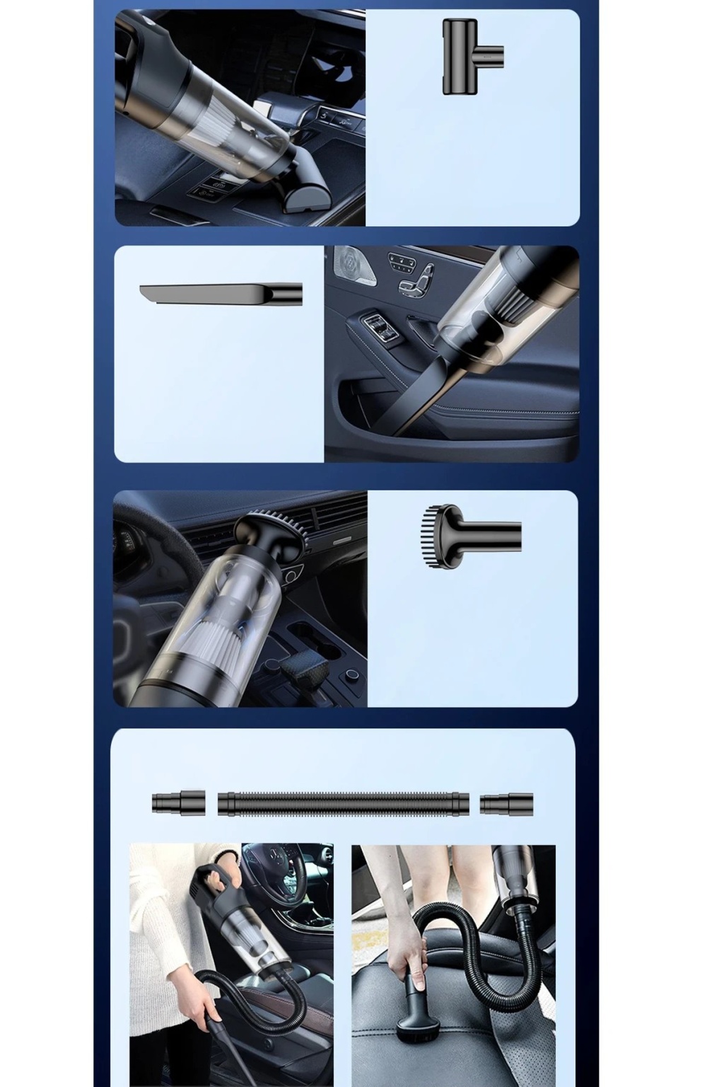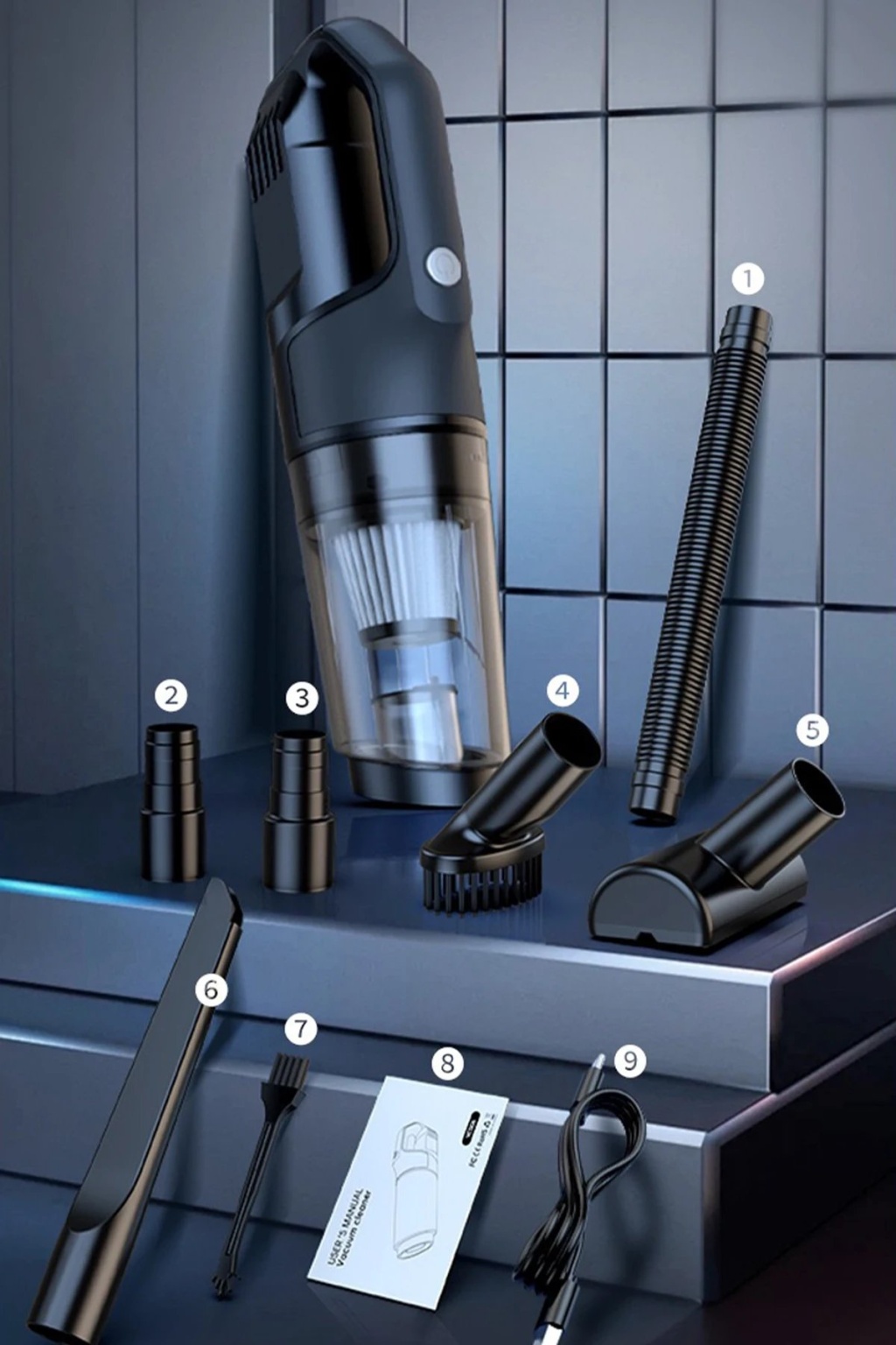 Yüksek emiş gücüne sahip, şarj edilebilir ve kablosuz taşınabilir aspiratör; araç içi, ev ve ofis kullanımı için idealdir. Güçlü motoru ve geniş batarya kapasitesi sayesinde etkili ve konforlu bir temizlik sunar.
