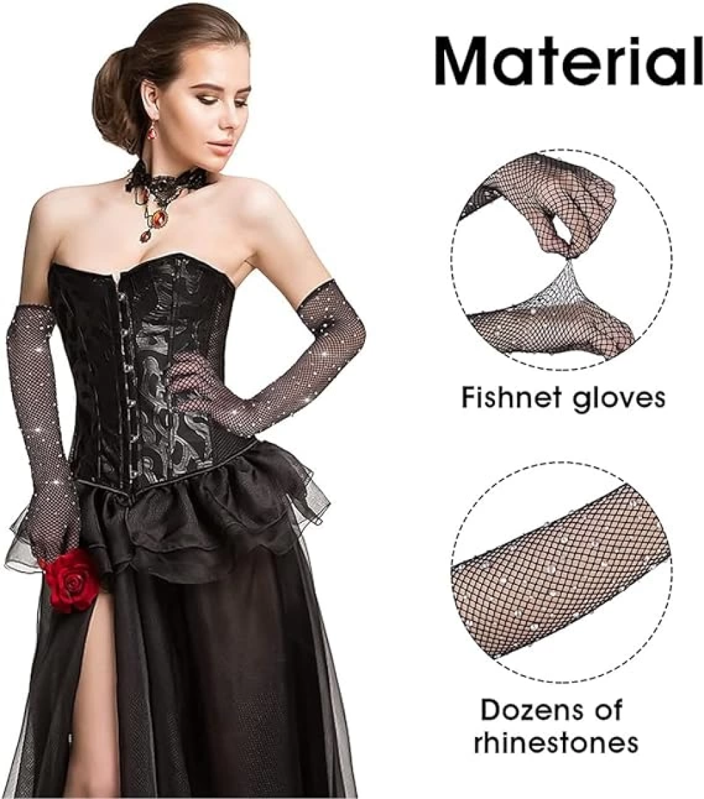 Siyah Renk İncili Elmas İşlemeli File Örgü Uzun Eldiven 45 Cm