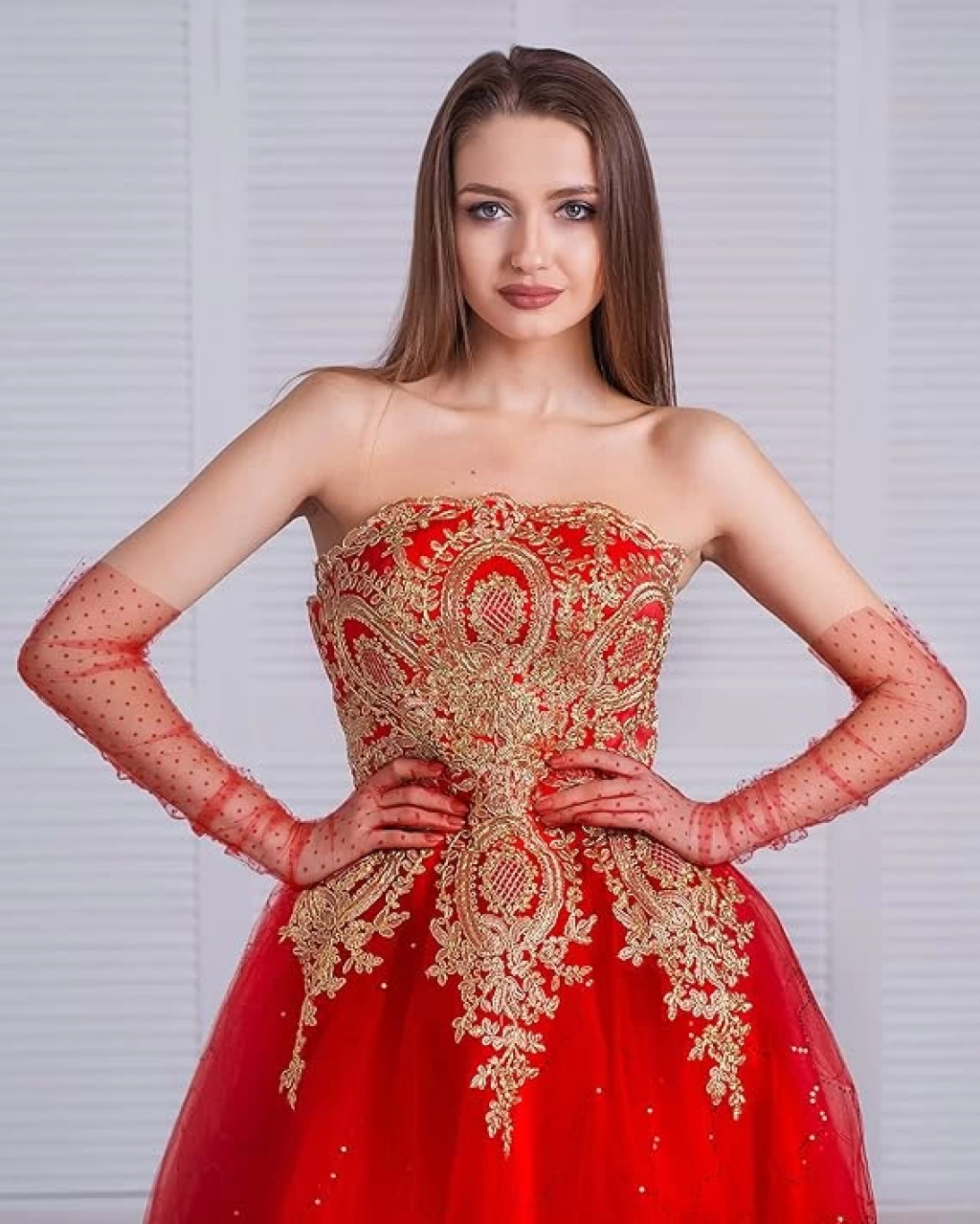 Uzun Boy Kırmızı Puantiyeli Kırmızı Renk Yetişkin Tül Eldiven 55 Cm